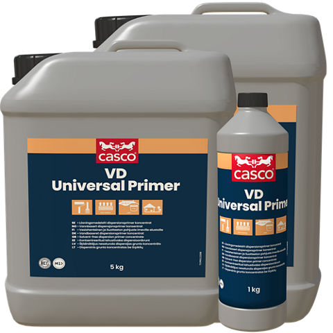 Casco® VD Universal Primer användas som primer för att minska absorptionsförmågan, för att förbättra vidhäftningen för avjämningsmassa på absorberande underlag och som skydd mot fukt från avjämningsmassor. Den kan också användas som tillsats vid blandning av vidhäftningsslamma. För icke absorberande underlag rekommenderas Casco® VD Super Grip.